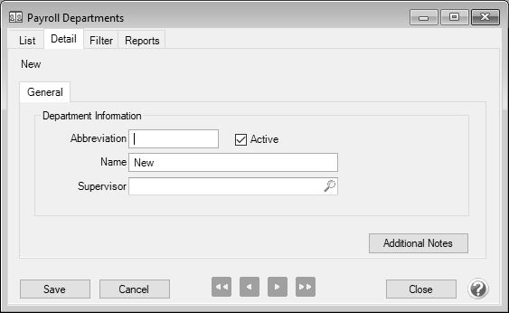 - Click Save to save the payroll department/group and return to the List tab, or click Close to save the payroll department/group and close the Payroll Departments/Groups screen.