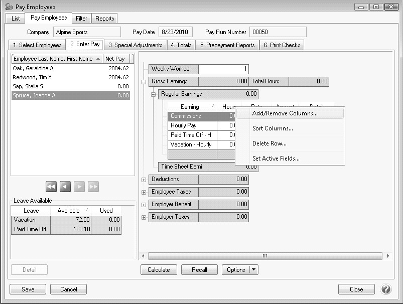 - While on the 2. Enter Pay tab in Pay Employees, right-click in the grid and select Add/Remove Columns.